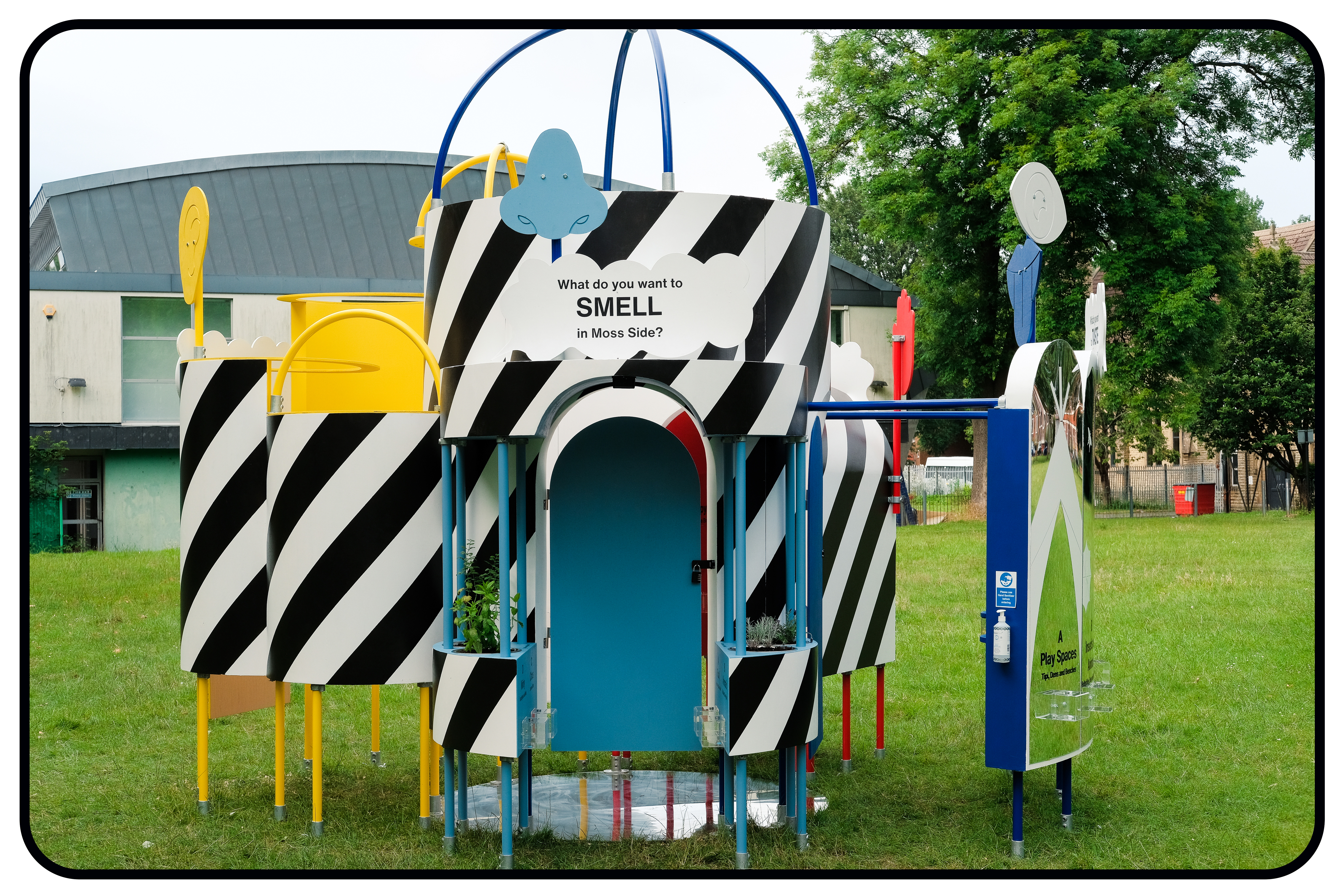 Overview: Comissioned as part of Hubbub’s ‘In Our Nature’ campaign which looked to inspire Manchester to living a more greener lifestyle; The Sensory Structure asked local residents of Moss Side, through playful engagement, what they would like to ‘See, Hear, Smell, Taste and Touch’ within their local park. Residents were asked to vote on their favourite ideas within each of these catagories or submit their own. The structure took inspiration from traditional follies, which were intended as a space from which to view nature; pattern from the Hubbub logo and colour from existing built elements within the park.